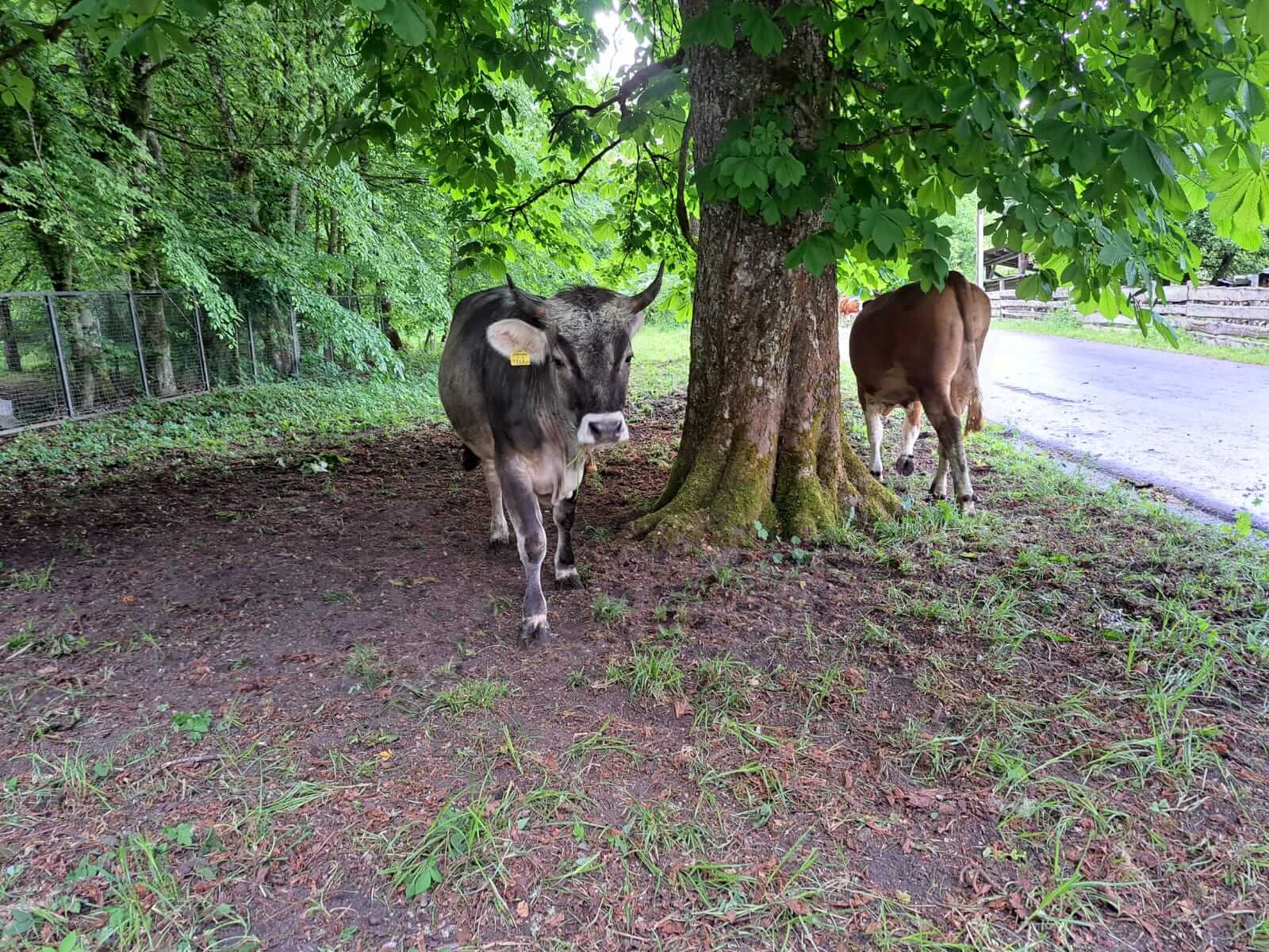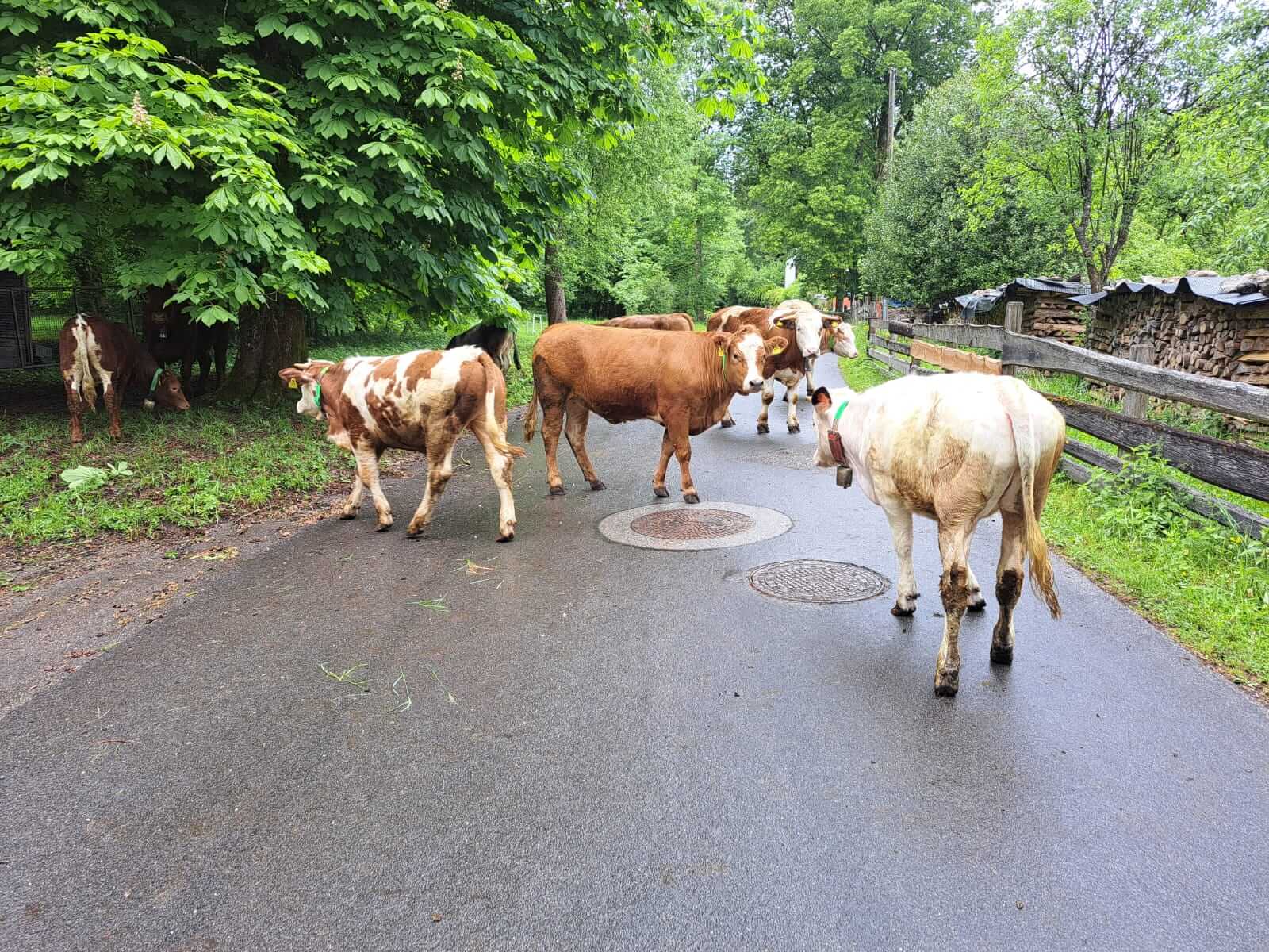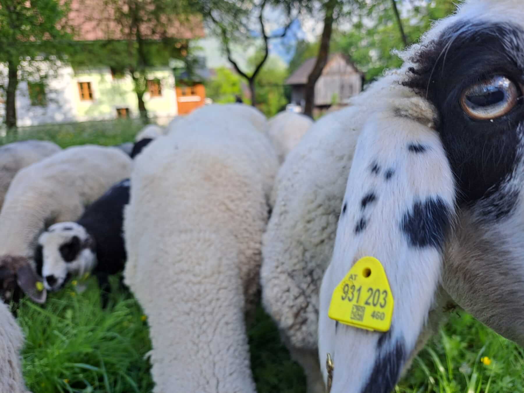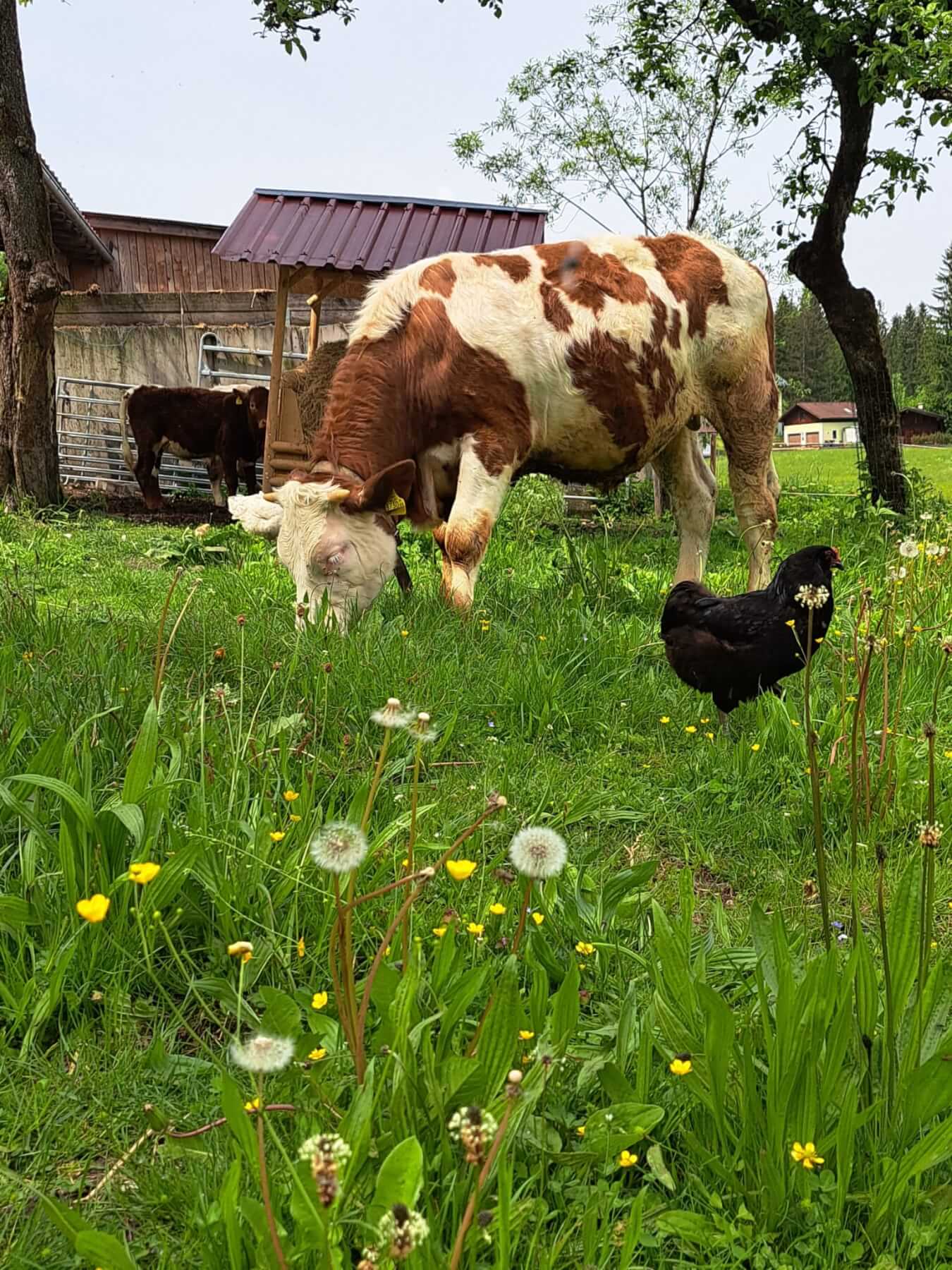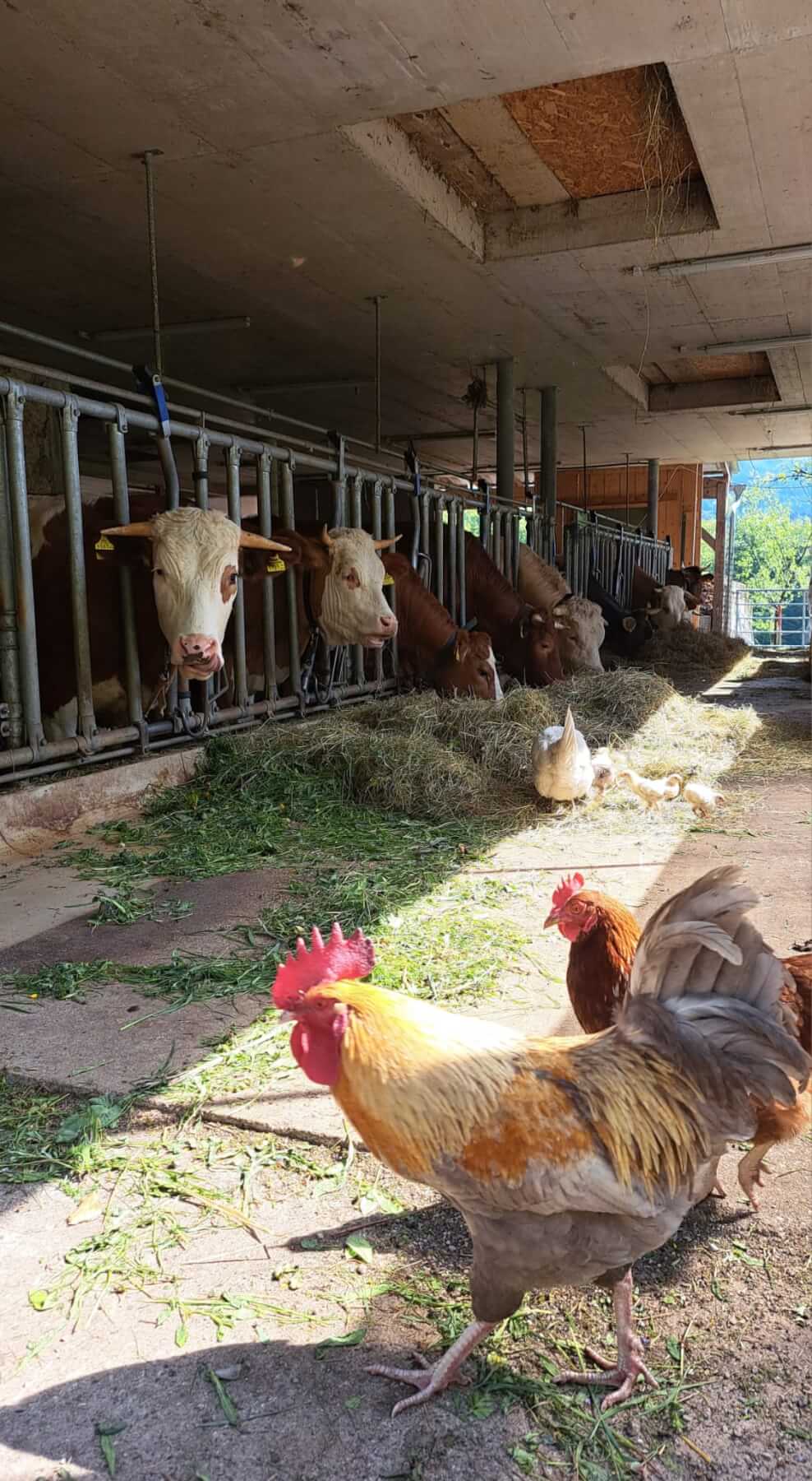 Bei einem Rundgang bei uns am Hof lernen wir Hühner, Schafe, Schweine und Kühe kennen.